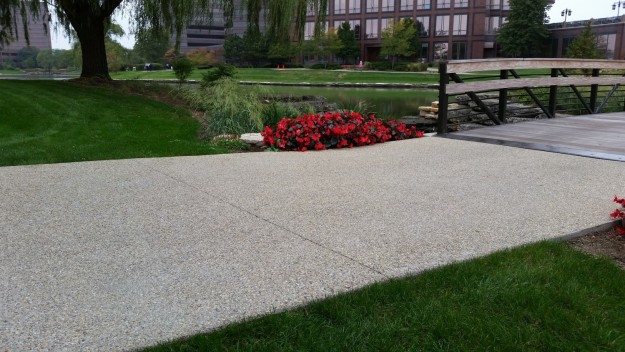 This beautiful project was installed at a senior living center in Barrington. The exposed aggregate pathway was designed to wind comfortably down what used to be a very steep slope. The walk was widened at multiple points to allow for benches so the residents could sit and enjoy the water features. The exposed aggregate concrete…
